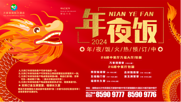 万家丽国际大酒店七星设计标准,四星收费,岁末感恩特惠,多款春节年夜饭套餐现已开启火热预定!预售狂欢价1888元起!用饕餮盛宴喜迎即将到来的龙年,即刻预订尊享多重福利,酒水饮料、果盘餐点、全家福合照免费赠送。更多详情请来电咨询。【酒店餐饮预订热线:0731-85909777/9776】