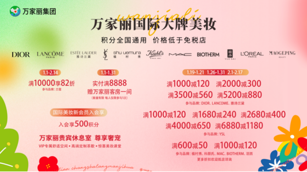 万家丽国际大牌美妆价格低于免税店,全国积分统一通用。1月26日至1月31日,2月1日至2月17日,DIOR、LANCOME、雅诗兰黛,满1000减120 ,满2000减300,满3500减560,满5000减850;YSL满1000减120,满1680减240,满2680减400,满4000减650,满6880减1180。植村秀、科颜氏、MAC、Biotherm、羽西,满600减50,满1000减120,欧莱雅、毛戈平、林清轩、珀莱雅抵店更有超多满额买赠惊喜等着你!1月1日至2月14日满10000享82折,(参与品牌:兰蔻),1月1日至1月31日实付8888元赠万家丽客房一间(数量有限,每人仅限参与一次)。