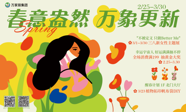 拒绝春困,唤醒活力!万家丽缤纷惊喜邀你共享美好~趣味手工、拍照打卡、美容美发、时尚春装、约会遛娃、生活购物、饕餮美食……快邀上三五好友一起来万家丽组个“春日局”吧!