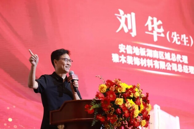 安信地板湖南区域总代理&雅木装饰材料有限公司总经理刘华先生发言表示,作为在万家丽经营二十多年的老商户,跟大家分享一点经营心得,做任何事都要讲究天时、地利、人和,盲目投资、四处开店只会自乱阵脚、草草收场,2002年,刚面临下岗的我踏入了建材行业,抱着选大品牌、大市场才有大收获的想法,毅然拿下安信地板湖南总代理入驻万家丽,才进万家丽没多久,就以年销售1800万的好成绩拿下了全国第一的好成绩,2015年的一场活动,更是定金就收了1100万现金,总销售近3000多万,成为了全国经销商的传奇与标杆,创下的销售记录至今无人打破。可以说,选对平台,跟对人很重要,黄董事长高瞻远瞩、亲力亲为让我少走了很多弯路,也让我在万家丽创造了人生与事业的巅峰,毫不夸张的说,当初我们第一批入驻的品牌几乎人人都是千万富翁,亿万级别的也不在少数。万家丽是一个与时俱进,拥有立体交通、物业自持等优势的繁华商圈,是其他卖场无法模仿更无法超越的强大存在,相信,在湘商翘楚黄董的指导下,安信地板定能实现每年15%增长的目标,公司发展会越来越好。