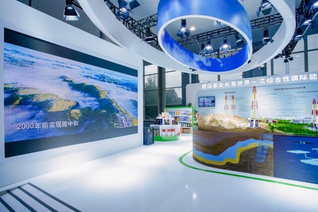 展台设计以白色为基调,融入绿色、蓝天等元素,体现中国石油向“绿”而行,守护碧水蓝天守望和谐自然的责任担当。展览分别为集团公司介绍、奋进中国式现代化的石油之力、赋能大美青海三个单元。展台中心综合一体化沙盘展示了综合能源站、塔里木超深井、大庆油田丛式井组、西南威远页岩气开发、大庆水上光伏、吉林油田CCUS示范基地、风力发电、地热、制氢、LNG码头等场景。昆仑好客商品展区展示了青海销售及广西、重庆等销售公司的消费扶贫产品。