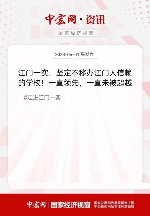 4月1日,国家发展和改革委员会主管、中央新闻网站——中宏网丨国家经济视窗,以上为题,聚焦江门先行先试的学校!江门一实,又为狂飙的江门人迎来一次美誉。
