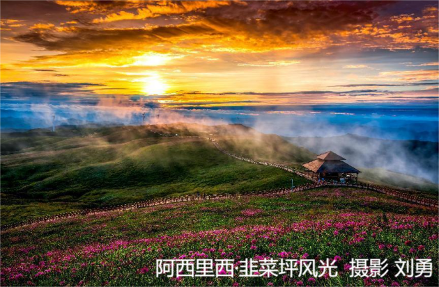 8月12日上午 采风团来到贵州屋脊韭菜坪。韭菜坪是世界上面积最大的野生韭菜花带、全国唯一的野生韭菜花保护区。每年农历八月,韭菜花千亩连片,随风摇曳,山体被渲染成紫色的海洋。韭菜花开,沁人心脾,悦人耳目。苗族的《芦笙葬曲》、彝族的《铃铛舞》、中国十大少数民族歌曲《阿西里西》,早已声名远播。这里是多彩贵州离天最近的地方,是洒落在人间的仙境。敬文东、喻子涵、邱婧、张野、阿索拉毅、杨碧薇、赵海霞、空空、彭澎、黄成松、罗逢春、宋武全、张露、孙阿木、令狐雅琪等评论家、诗人对韭菜坪民族文化的保护和高端旅游度假地的打造,给出了很高的评价。