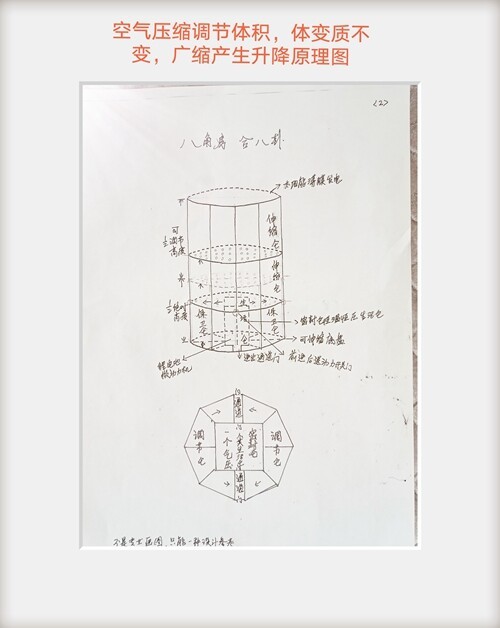 象潜水艇浮沉原理方法一样,体积固定,向外抽气或进气,形成机内外空气压力差,产生空气浮沉原理,在地球大气层中将人造天体八角房自然升降进入运行轨道中。