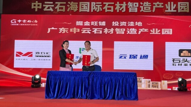 广东云浮“白石世界”再引领中国石都新方向!中云石海董事长关海棠与入驻企业广东石海美家建材、云浮市硕城石业、云浮市欧豪石材、云浮市小石头网络科技现场签约。
