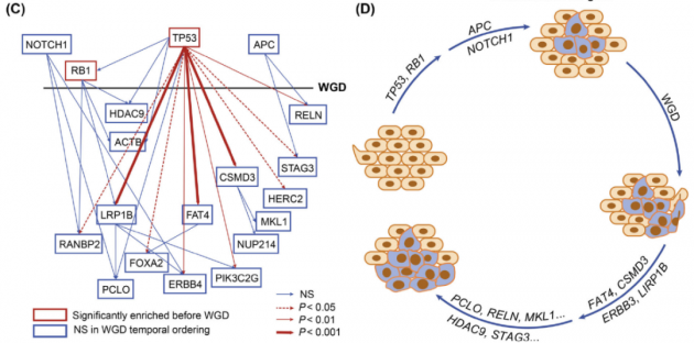 依据突变克隆性和与WGD相关的潜在时间顺序,以此进行分组的比较分析,得出的结果支持一个理论的产生:GI-NEC肿瘤细胞首先在TP53,RB1、NOTCH1和APC出现克隆突变,随后在出现WGD前后,癌症相关基因(LRP1B、CSMD3、FAT4和ERBB4等)出现克隆突变,最后在RELN、PCLO、MKL1等基因中发展出亚克隆突变(图5B-D)。