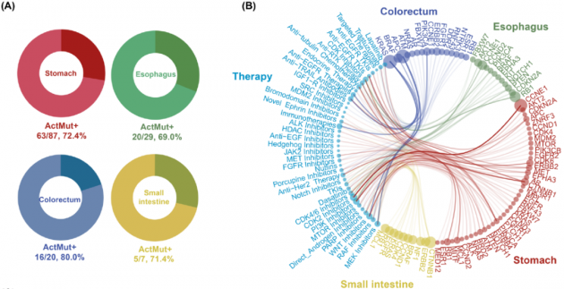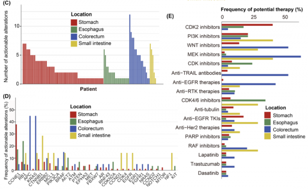 对靶基因或相关重要基因的突变检测,在针对肿瘤患者的靶向治疗中起到越来越重要的作用。结果表明,绝大部分GI-NEC检测到临床治疗相关基因的驱动突变,但不同部位的NEC表现出多样性,其主要的潜在治疗收益来源于不同类型的靶向药物。可见,鉴于不同肿瘤部位的基因突变差异,依据NEC主要起源部位量身定制相应的靶向治疗方案是很有必要的(图4A-E)。